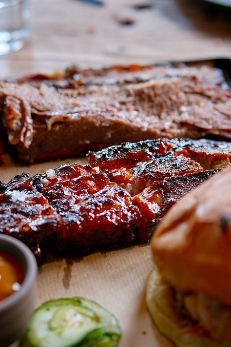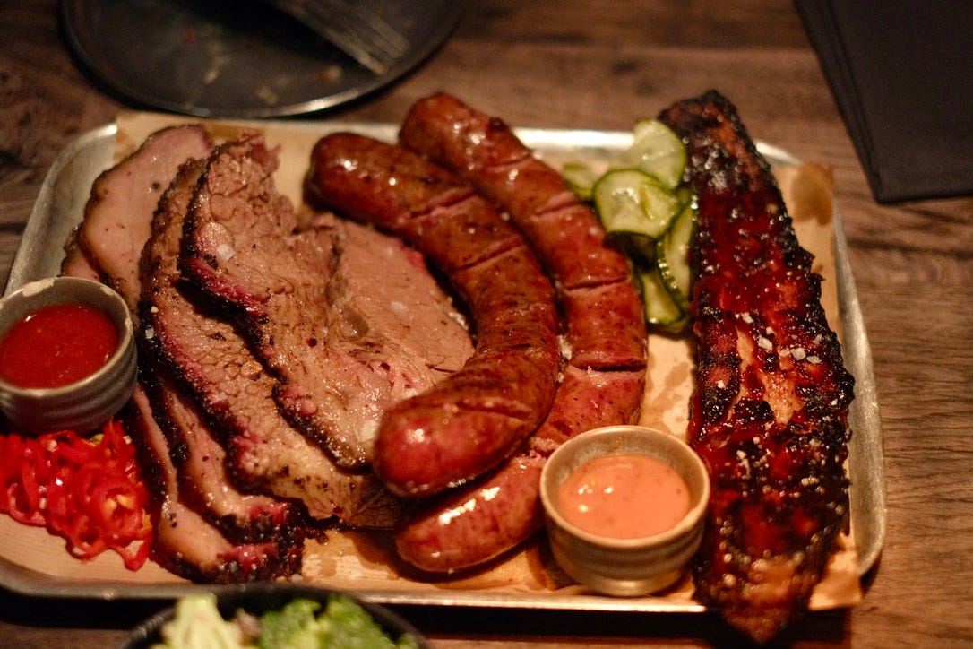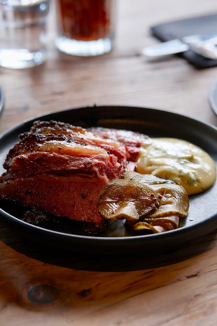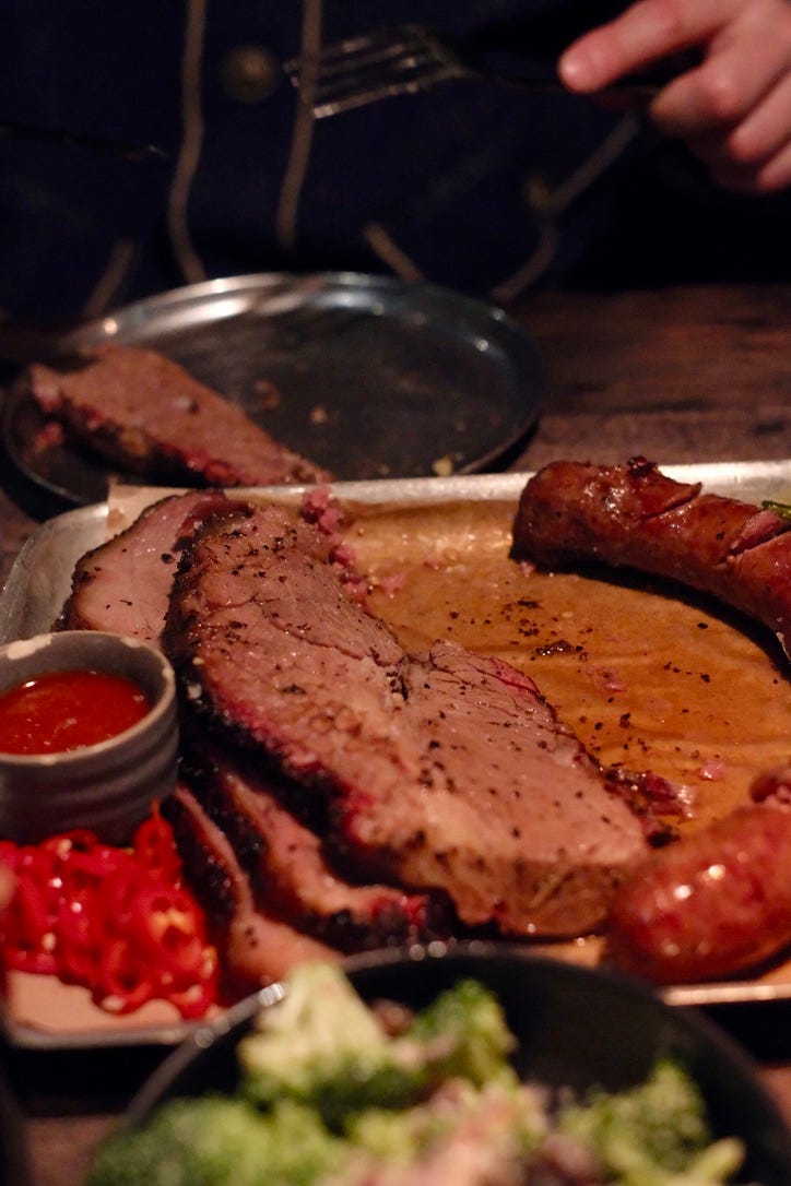 菜單上選擇不多,但每道菜都精心打造,特別是他們的brisket,是餐廳的招牌菜之一。這道煙燻牛肉外表略帶酥脆,內裡則是極其柔嫩多汁,煙燻風味濃烈,每一口都讓人感受到肉質的豐富層次。餐廳的秘訣在於其低溫慢燒的技術,這樣能使得牛肉的脂肪與肉汁完全融入,口感上達到完美的平衡。與此同時,搭配的酸黃瓜和醃製紅辣椒不僅能緩解肉類的油膩感,還能帶來清新的口感對比,讓整道菜更具層次感。