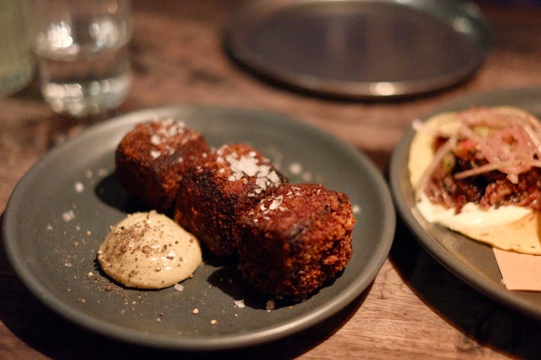此外,餐廳的 Crispy ox cheek也是值得一試的特色菜。這道菜用傳統的煙燻技術將牛膝燒至嫩滑,再加上外脆內嫩的炸皮,搭配Anchovy Mayo的醬汁。